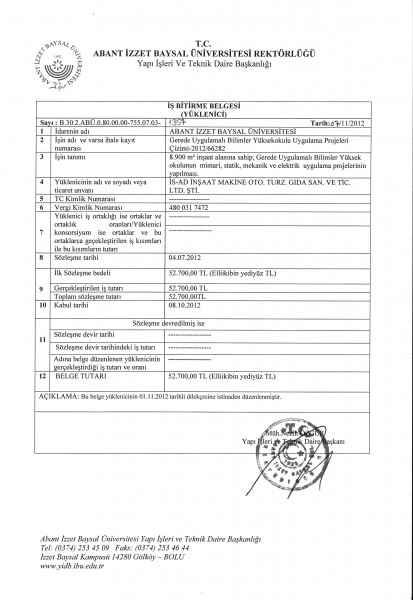 Abant İzzet Baysal Üniversitesi Gerede uygulamalı Bilimler MYO İş Bitirme Belgesi