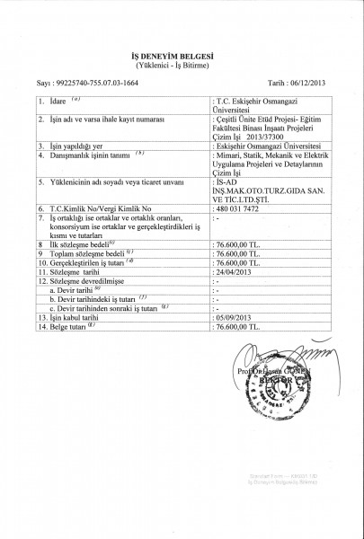 Hatay Mustafa Kemal Üniversitesi Mimarlık Fakültesi İş Bitirme Belgesi