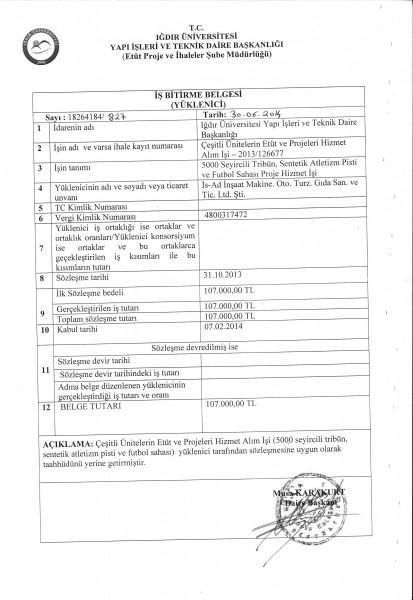 Iğdır Üni. 5000 seyircili tribün, sentetik atletizm pisti ve futbol sahası İş Bitirme Belgesi