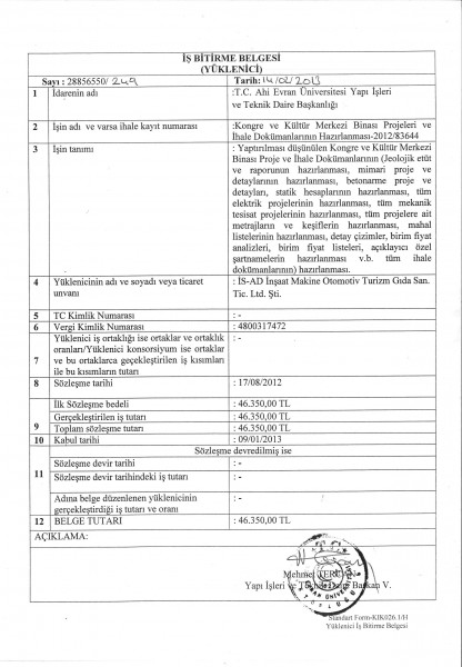 Kırşehir Ahi Evran Üniversitesi Kongre ve Kültür Merkezi İş Bitirme Belgesi